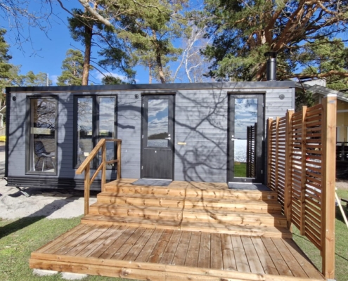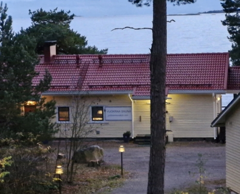 Tämä on erillisauna ja se on vuokrattavissa vain kesäkaudella – toukokuun alusta lokakuun puoliväliin. Lauteille mahtuu kerrallaan 5 henkilöä. Oleskelutila on sopiva enintään 8 henkilölle. Tässä oleskelutilassa ei ole takkaa. Sauna sijaitsee nykyisen saunarakennuksemme oikealla puolella nurmikkoalueella. Lauteilta ja oleskelutilasta on upeat merinäköalat etelään/länteen. Tämä saunarakennus käsittää kaksi huonetilaa – oleskelutila (pöytä, sohva, tuoleja) sekä löylyhuone. Galleriasta löytyy kuva ja tästä linkistä video.